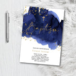 Baptism Invitation for Boy - Blue or Green and Gold Watercolor splash with Glitter Confetti - Printed or Printable Invites