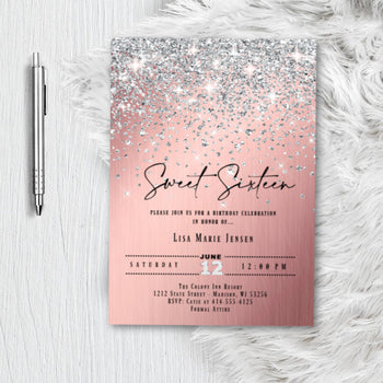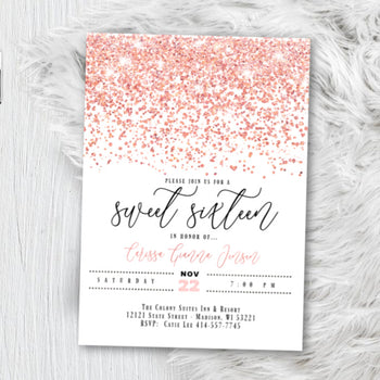 - Invitations with a “Glitter” effect do not come printed with actual glitter; this is a graphic effect that is printed to resemble glitter.