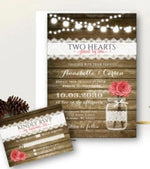 Navy and Yellow Wedding Invitation Set with RSVP, Rustic Mason Jar, Floral Wood and Lace Country Barn Printed Invitations